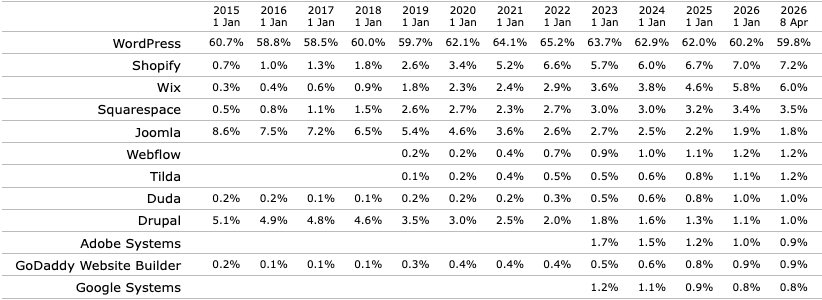 Parmi les plus connus, vous reconnaitrez des noms comme WordPress, Shopify, Wix… Si on en croit W3Techs, WordPress représente à lui seul près de 60 % du marché au 8 avril 2026.